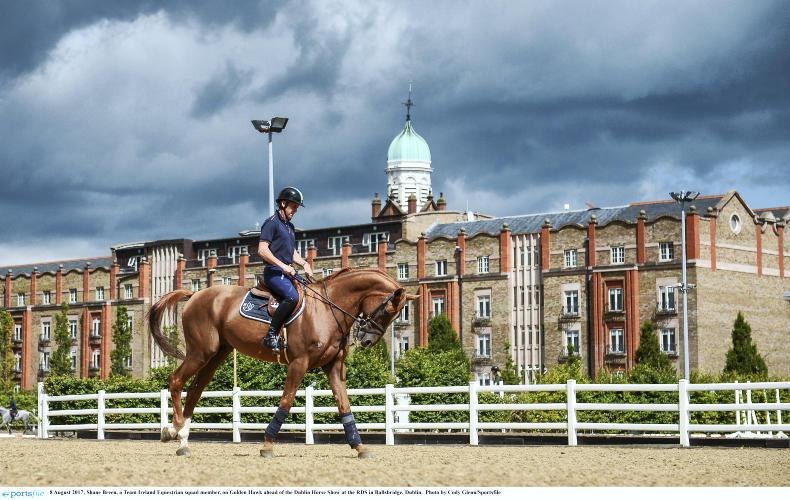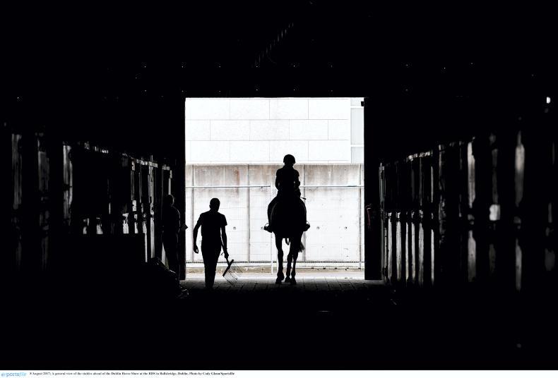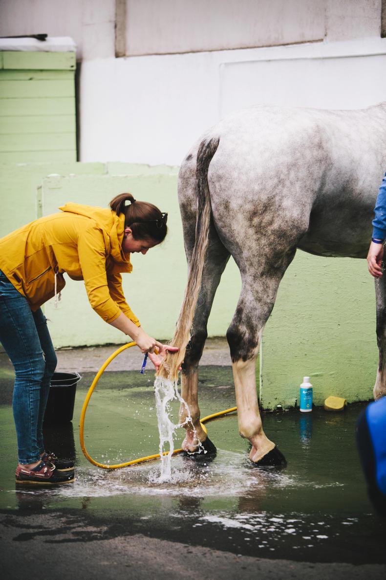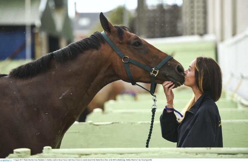 Mahiri Rawluk comforts Dawn Chorus while he is being is washed down at the RDS