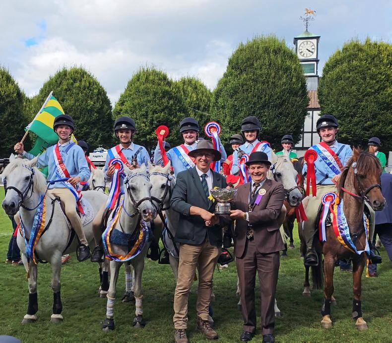 We did it again! Meath Hunt Pony Club Senior Mounted Games celebrating at the RDS. (Back row l-r) Jack Mangan on Sprite, Harriet Mangan on Scooby, Lauren Callery on Jimmy, Sadhbh Monaghan on Storm and Daniel Callery on Cruise. (Front row) Mark Crowe Meath (coach) and John Leonard who presented the Cup to the winning team