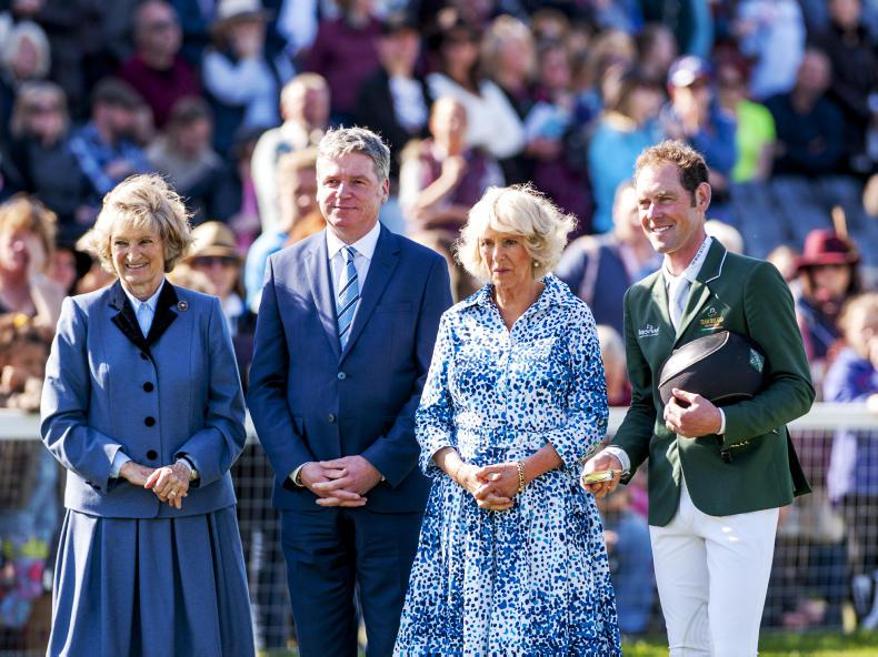 Ireland's Joseph Murphy receiving the Glentrool Trophy at Badminton from the Duchess of Cornwall. The trophy is awarded to the combination that most improves on their dressage score. Murphy and Sportsfield Othello rose an incredible 62 places to finish in overall 13th place (Photo: Equus Pix/Pam Cunningham)