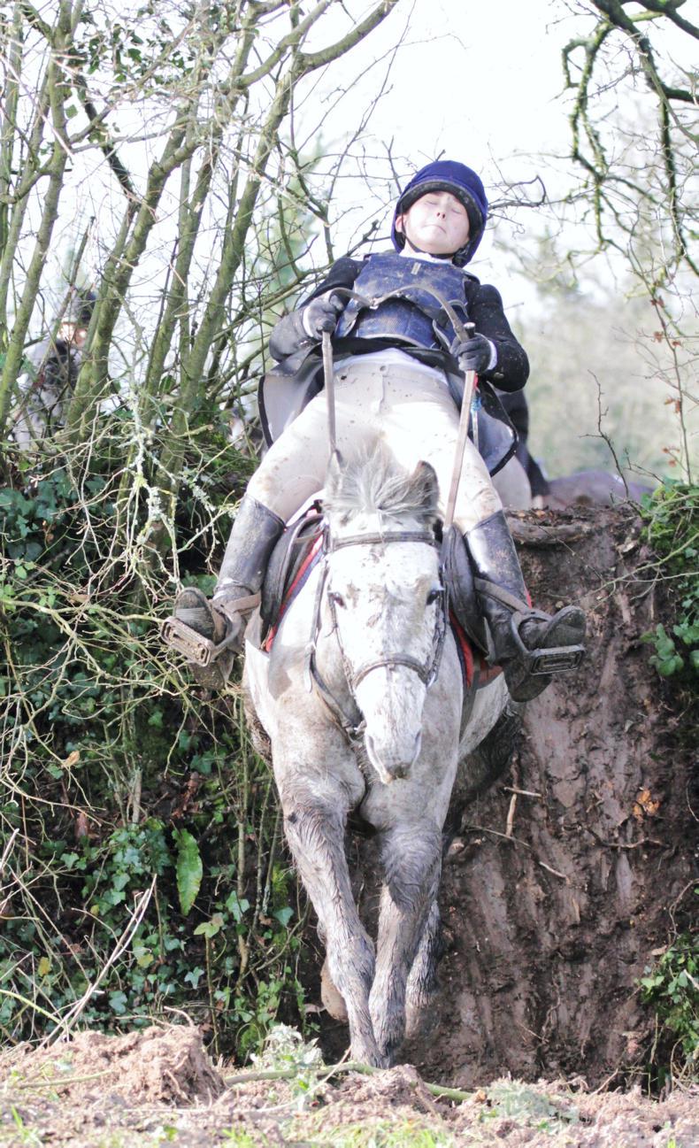 Out hunting with the Scarteen Foxhounds was Erin Ryan (12) with pony Hiccup making it over a big double at Hospital, Co Limerick