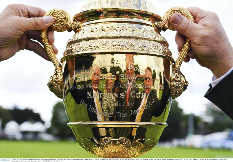 All eyes are now on the Aga Khan Nations Cup next Friday, August 11th at the Dublin Horse Show. Members of the Dream Team, the three-in-a-row winners (1977-1979) held the beautiful trophy yesterday including Eddie Macken, Con Power, James Kernan while the late Paul Darragh was represented by his brother Dave and sister Jane (Photo: Sam Barnes/Sportsfile)