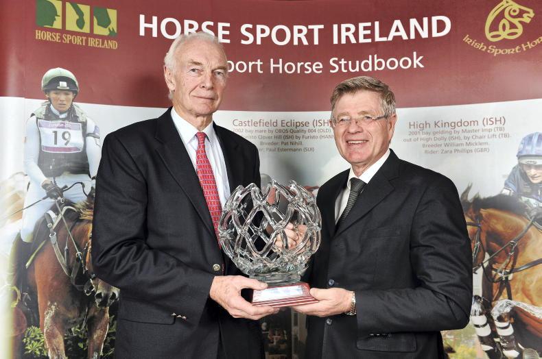 John Hughes receives the HSI Outstanding Contribution to ISH Breeding award from Jim Beecher, chairman of the Breeding Sub- Board HSI, during the HSI Annual Breeder Awards, Bloomfield House Hotel, Mullingar, Co Westmeath in November 2013 \ Barry Cregg Sportsfile