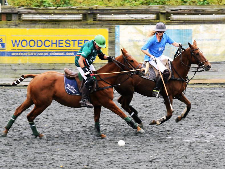 Tom MacGuinness of Horseware fends off April Kent of RITS team at the Summer Seaon final at Polo Wicklow's arena (Photo: Kim Mullahey)
