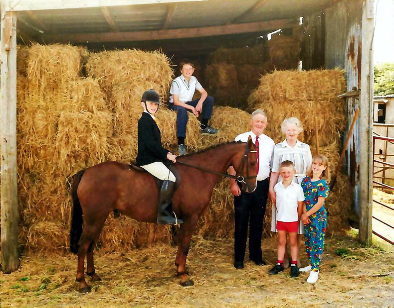 Eugene Maher's four children with their grandparents, Sean and Peggy Maher. David Maher on one of his grandfather's Goldengrove ponies, Sean on the hay bales, Enda and Maura beside their grandparents
