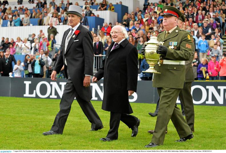 Aga Khan Day at the RDS 2015: The President of Ireland Michael D. Higgins, centre, and Matt Dempsey, RDS President, left, walk to present the Aga Khan Cup to Ireland after the Furusiyya FEI Nations Cup during the Discover Ireland Dublin Horse Show \ Cody Glenn / Sportsfile