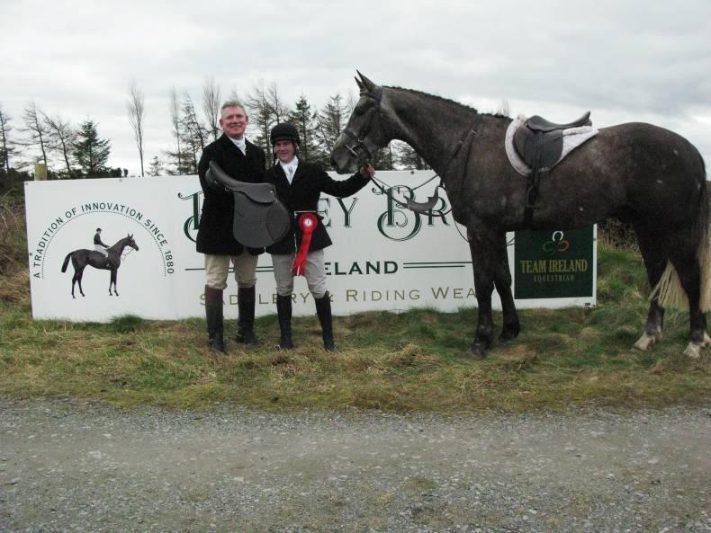 Garry Carroll and Milestone Harry, winners of the Kildare Hunt Club Performance Hunter Show hunstmans class, are presented with a Berney's saddle from sponsor and runner-up Tom Berney