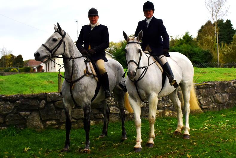 Galway Blazers' hunt secretary Stephanie MacDonagh and Theresa Kennedy Lydon at the Blazers' opening meet from Raftery's Bar \ Noel Mullins