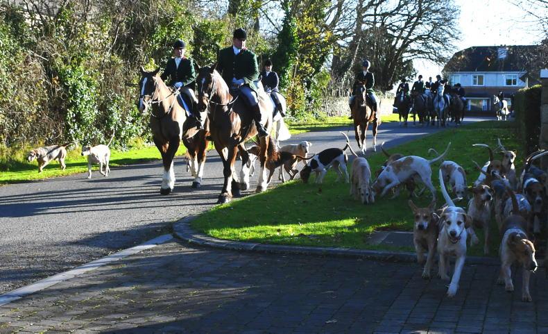 The hunt staff line-up has many of that former crack Killinick Harriers front row team that I saw in action many times over the years. Huntsman Paul Scallan and whippers-in Johnny Murphy and Albert Whitehead are three of the most talented horsemen that every crossed the Irish countryside. There was always competition even up front with the hunt staff in Killinick and I remember master and huntsman John Stafford, with hounds screaming away on front, trying to get to a five-bar gate before Paul Scallan who was whipping-in.