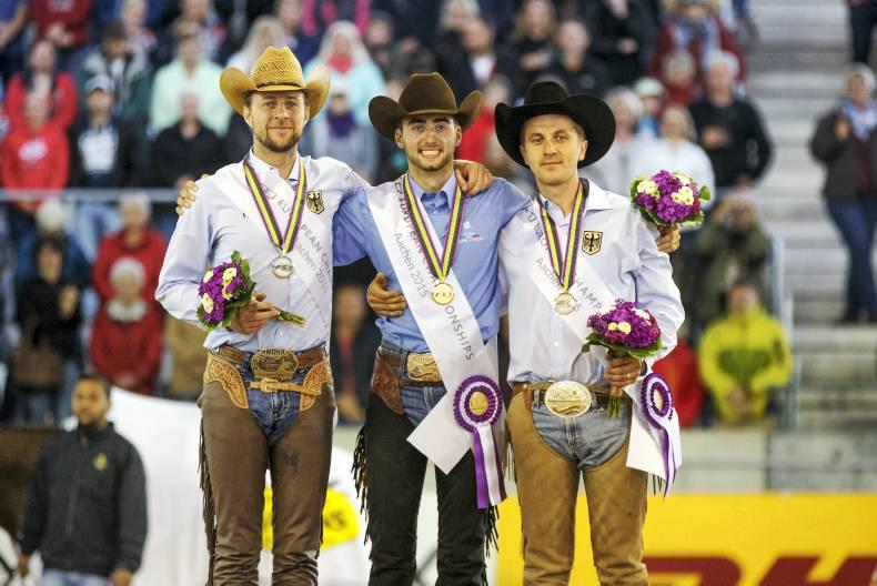 German athletes dominated the individual male final at the European vaulting championships in Aachen. Over 5,000 spectators roared with delight as relative newcomer, Jannis Drewell, pinned fellow-Germans Thomas and Viktor Brusewitz in silver and bronze when producing a stunning final freestyle test.