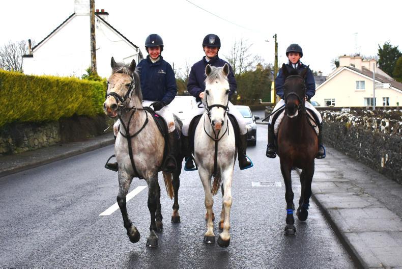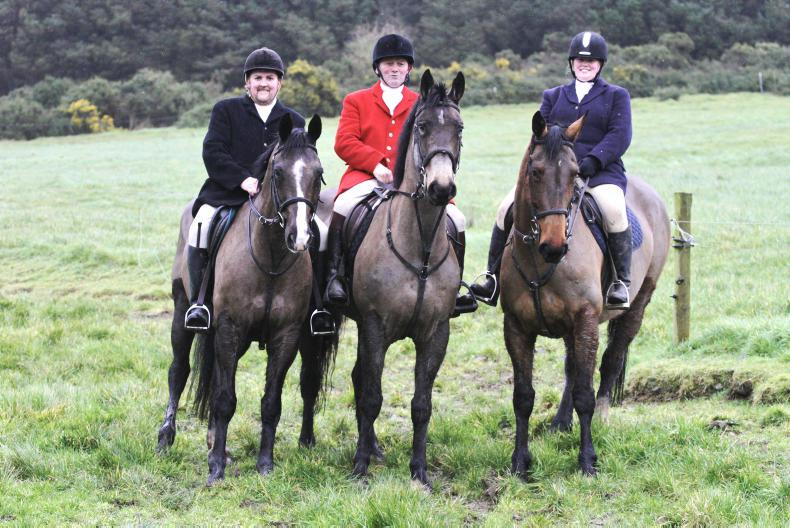 Young riders Niamh Leahy, Rachel McAlinden, and Niamh Horan hunting with the East Galway Foxhounds at Kilconnell (Photo: Noel Mullins)