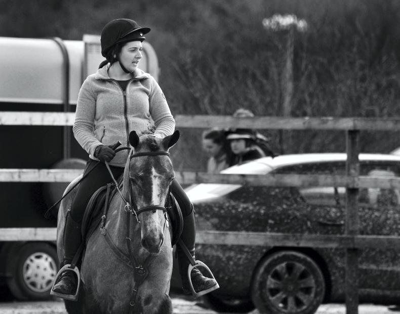 Racehorse trainer and joint master of the Iveagh Foxhounds Sarah Dawson (right) takes the followers for a canter over her training gallops at The Hawthorn Inn (Photo: Noel Mullins)