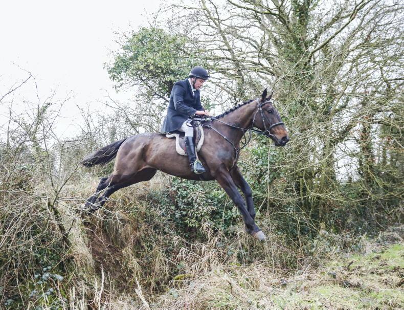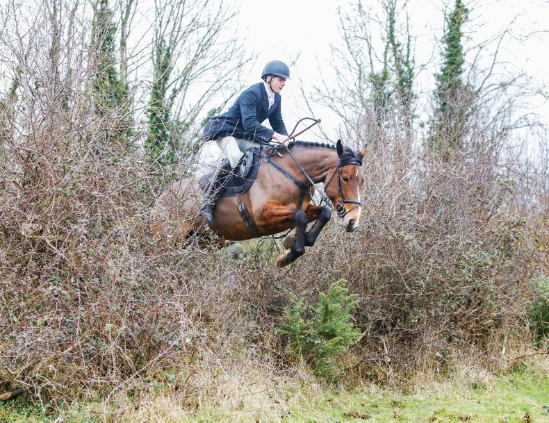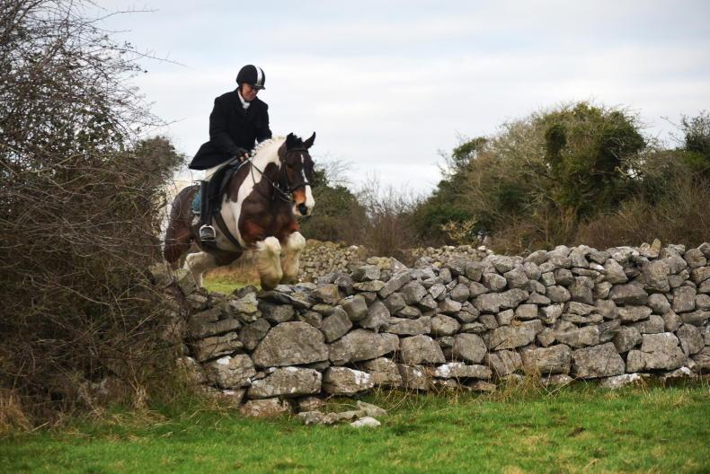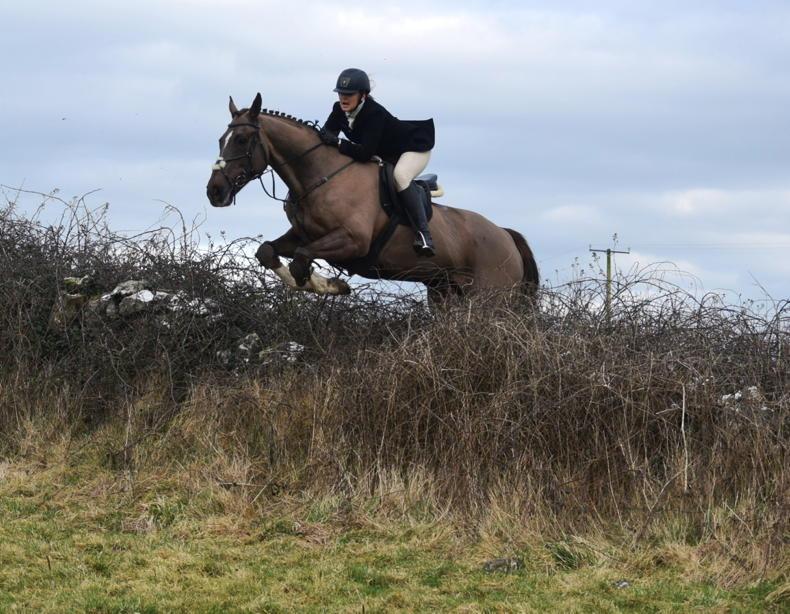 Mary Murphy sailing over a hedge at the Headford meet with the North Galway Foxhounds \ Maura Morrin