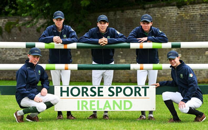 The Children on Horses Showjumping team, from left, Harry Rush, Ruby Lily Gaines, Showjumping Youth high performance manager James Kernan, Alice Moloney, Michael Phillips of Gain Equine Nutrition, Lily Tunney and Cian McMunn during Horse Sport Ireland Youth Show Jumping Final training at the National Horse Sport Arena in the Sport Ireland Campus in Dublin \ Brendan Moran/Sportsfile