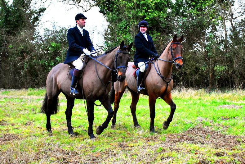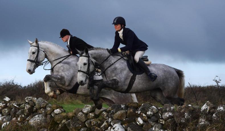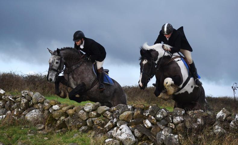 Aisling McGrath and Alan McNulty, out with the North Galway Foxhounds, clearing a wall together in Shrule \ Maura Morrin