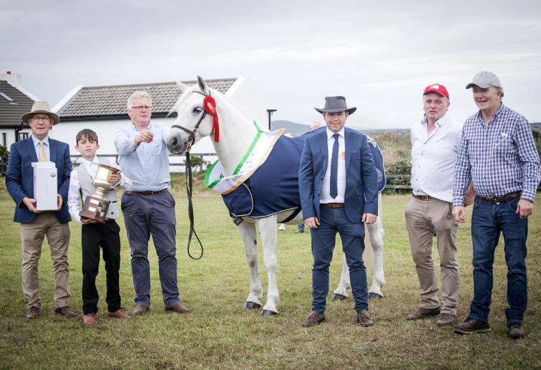 Bernard Keaney's Murvey Rita, winner of the 13-year-old plus mare class, was crowned the Supreme Champion of Roundstone Pony show. Pictured with (l-r) judge Gerry Mahon, Bernard Óg Keaney, Bernard Keaney, judge Patrick Mahon, and Marty and Thomas Keaney \ Rynes Walker