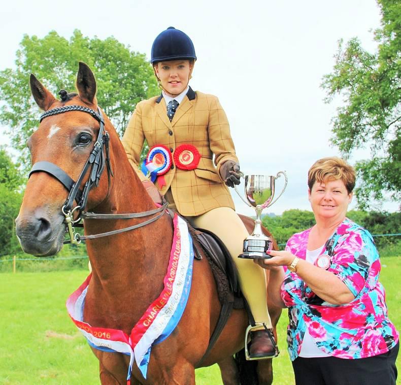 Alannah Glynn with Yealand Pilgrim, the 'al fresco' supreme champion pony at Charleville Show being presented with the Joe Carroll Insurances Cup by Bernie Carroll (Photo: Susan Finnerty)