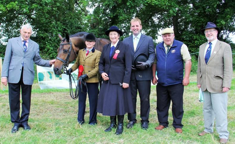 Travelling Solo, winner of the Horse Sport Ireland broodmare championship at Charleville Show with Dan O'Connell, ISA; Breid Shannon; judge Henrietta Knight; owner John Roche; HSI board member Paddy McCarthy and David Sheehan, ISA (Photo: Susan Finnerty)