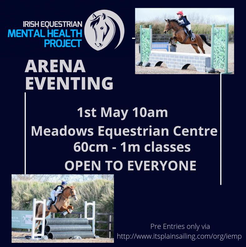 THE Meadows Equestrian Centre in Lurgan is the venue for Arena Eventing on Sunday, May 1st next and it’s hoped that as many riders as possible will turn out to support it. The day starts at 10am with classes from 60cm to one-metre.