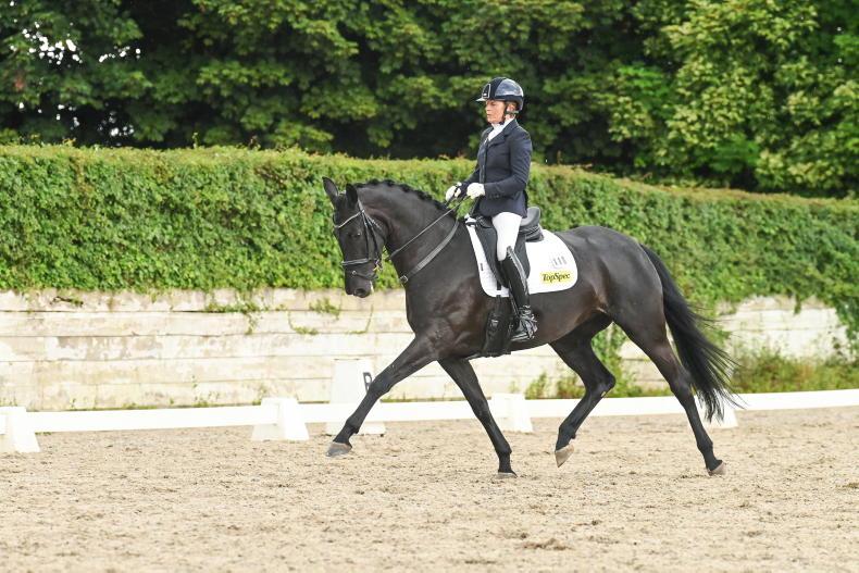 Attending just her second show of the Dressage Ireland season, the black daughter of Formidable ran out an impressive winner of the Demlay Equestrian Novice championship, in which she held off 17 rivals, and of the non-championship class for five-year-olds in which she faced just two opponents. The only starter in the non-championship six-year-old class was the Dutch Warmblood gelding Olaf Van Lange Weeren (by Hennessy) who was partnered by his owner, Iris Walshe.