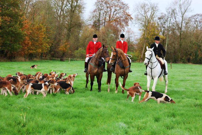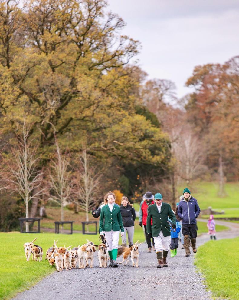 Grace Kerr and Des Bell lead Mr Kerr's Beagles off from the meet at Ballynure last weekend \ Siobhan English Photography
