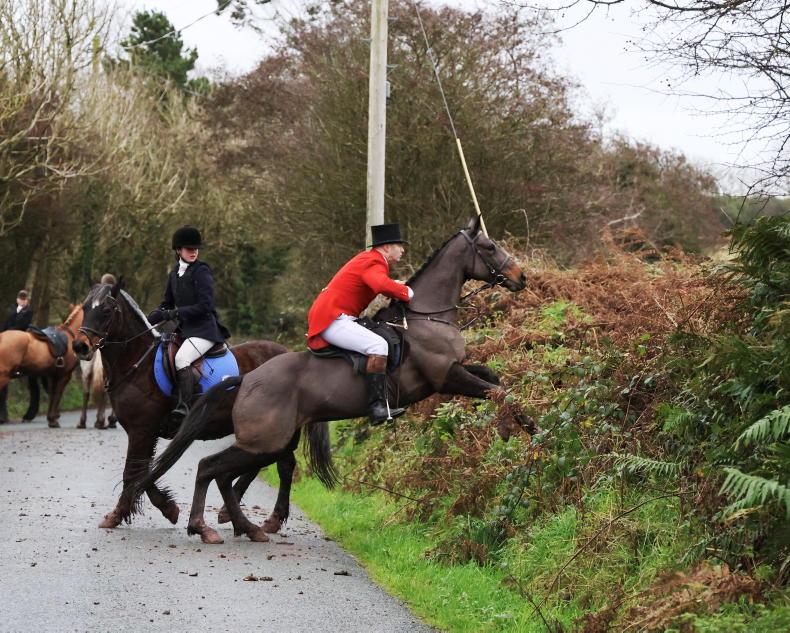 Spotted out for a day with the Muskerry Foxhounds was equine artist Liam Clancy with his daughter Fleurette taking on a high bank \ Catherine Power