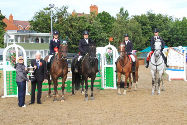 The winning Greenhills team at the AIRC Horseware Team Show Jumping Championships of Grainne Alexander (Knockenpower Ginger), Sean Rooney (Navarone), Roland Dalton (Benny Hill), Olwyn Butler (Santero) and Mary Kane, chef d'equipe, with AIRC vice president Gerry Thompson after the team won the team event after a 10-year wait