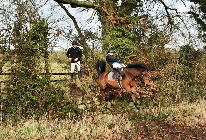 Ten-year old Harvey Foley sitting well back jumping a double bank at the Carlow Farmers Foxhounds meet at Corries Cross \ Noel Mullins