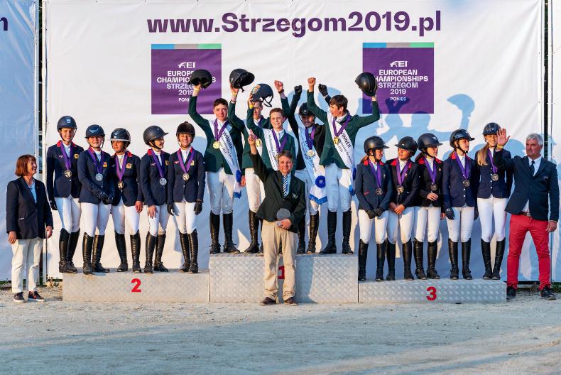 The Irish pony show jumping team of (l-r) Francis Derwin, Max Wachman, Tom Wachman, Niamh McEvoy and John McEntee, with chef d'equipe Gary Marshall on the podium after winning team gold at the 2019 FEI European Championships in Strzegom, Poland \ FEI