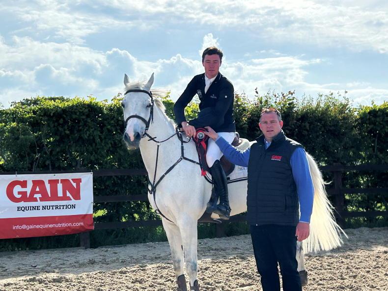 Francis Derwin Jnr on Destina Du Mesnil Z, runners up in the 1.40m Gain Alltech National Grand Prix at Kernan Equestrian Centre, receiving his prize from Niall O'Neill, representing Gain Horse Feeds