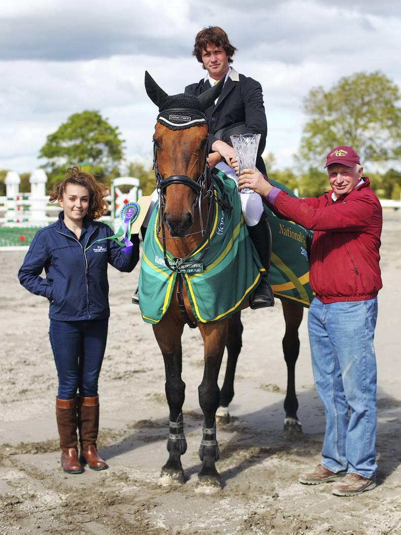 Thomas O'Brien and Ameretto, winners of the TRM/Horseware National Grand Prix at Galway Equestrian Centre, pictured with Rachel Gomez from TRM and Galway EC host Thomas O'Brien (Photo: Laurence Dunne/jumpinaction.net)
