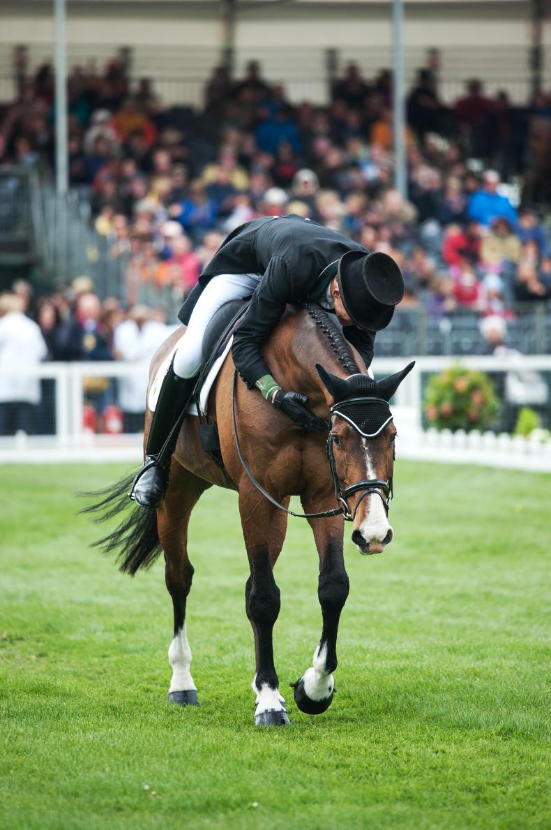 That's My Boy: Jonty Evans gives Cooley Rorkes Drift (ISH) a well deserved hug after a fantastic dressage test at the Mitsubishi Motors Badminton Horse Trials yesterday afternoon (Photo: Nigel Goddard)