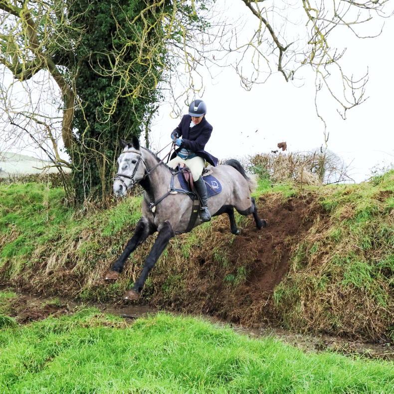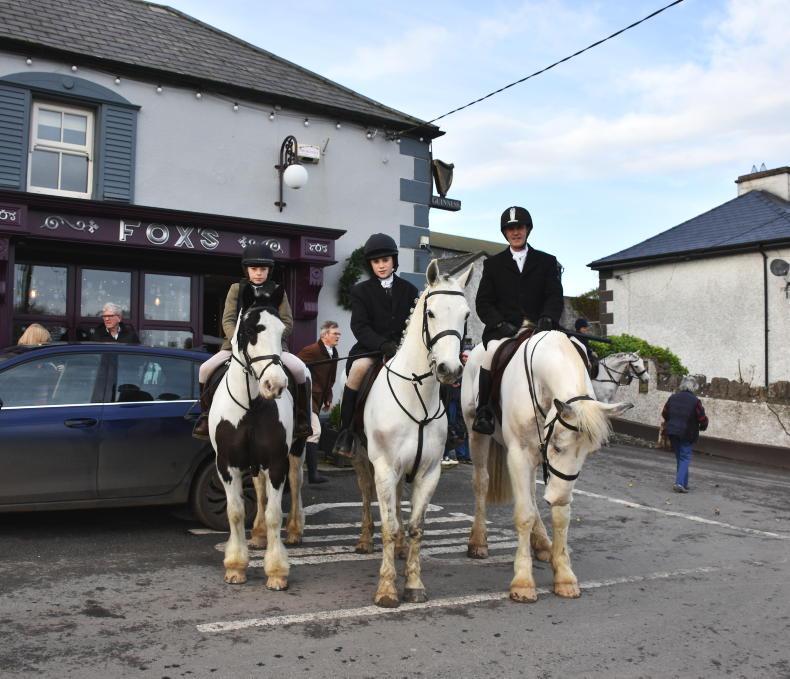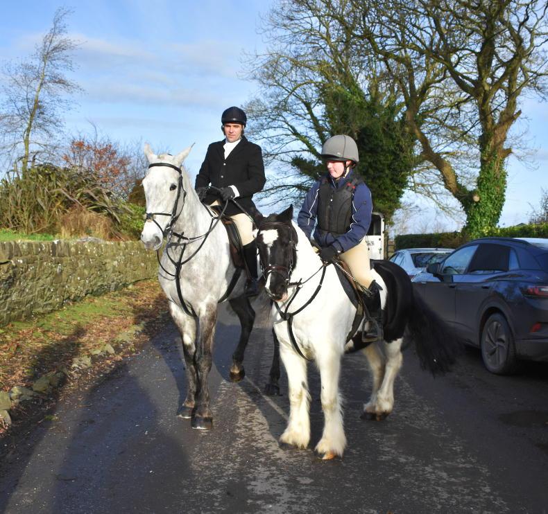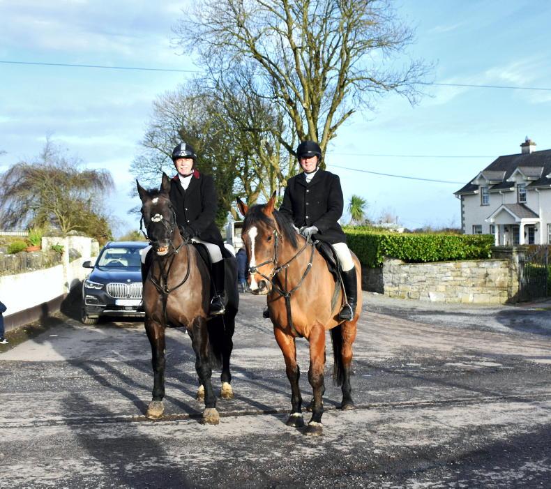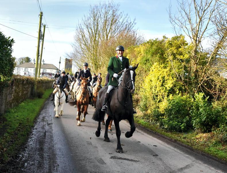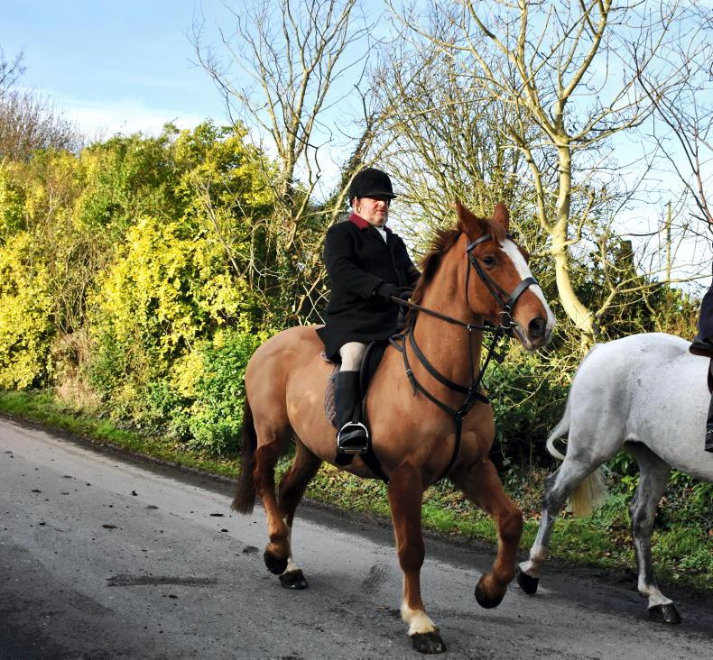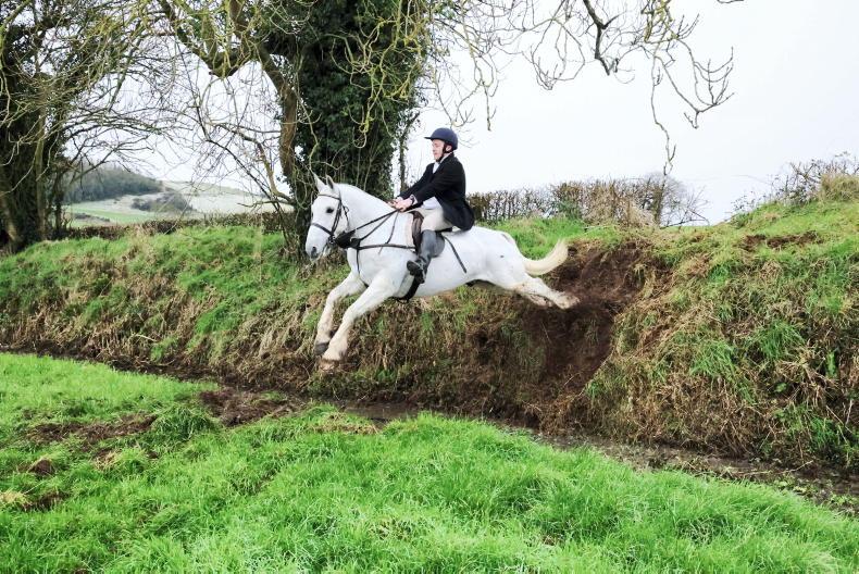 Visiting from Co Cork was Claire Collins on her first day’s hunting ever, making it safely over the bank, while out with the Limerick Harriers at Sheehan’s Cross \ Catherine Power