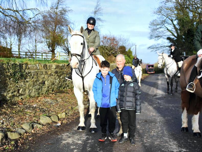 Former Tara Harriers whipper-in Liam Keogh and his daughter Suzann and grandchildren Ciaran and Culainn at the Tara Harriers meet at Skryne \ Noel Mullins