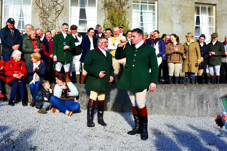 Tara Harriers joint master and huntsman Henry Smith handing over the hunting horn on his retirement to John Moran of Bective Stud \ Noel Mullins