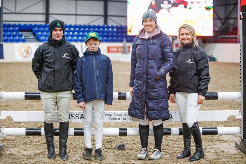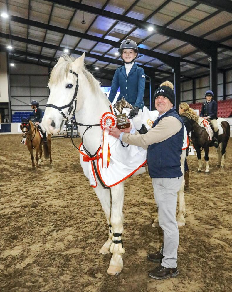 Ellen O'Neill is presented with her prizes from John Osborne of HRI after winning the Equuip Pony Christmas Cracker on Gateau Mr Blue \ Siobhan English