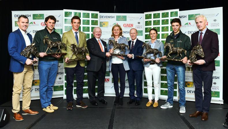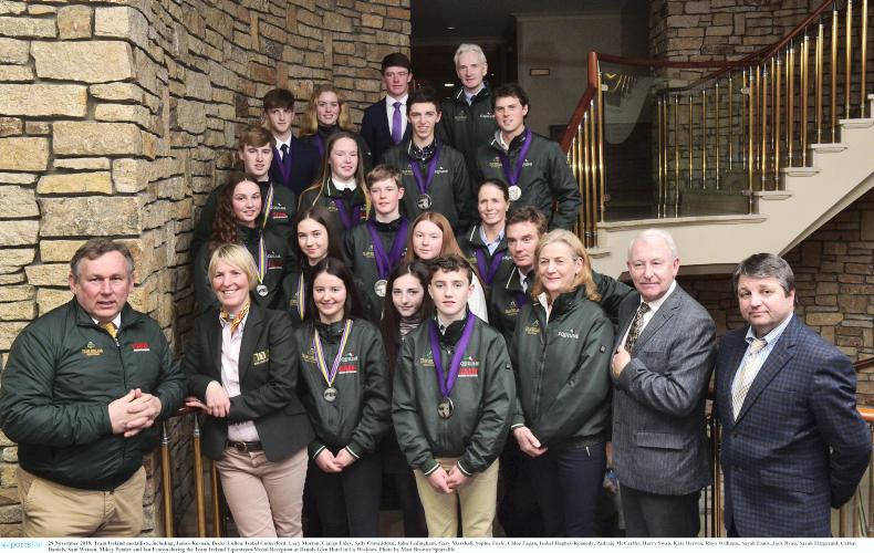 Children on Horses team manager James Kernan centre, with Joanne Hurley from GAIN and HSI CEO Ronan Murphy with European silver medal winning team members (l-r) Ciaran Foley, Sarah Fitzgerald, Lucy Morton, Isobel Hughes Kennedy and Rhys Williams during the Team Ireland Equestrian Medal Reception at Druids Glen Hotel in Co Wicklow. Photo by Matt Browne/Sportsfile