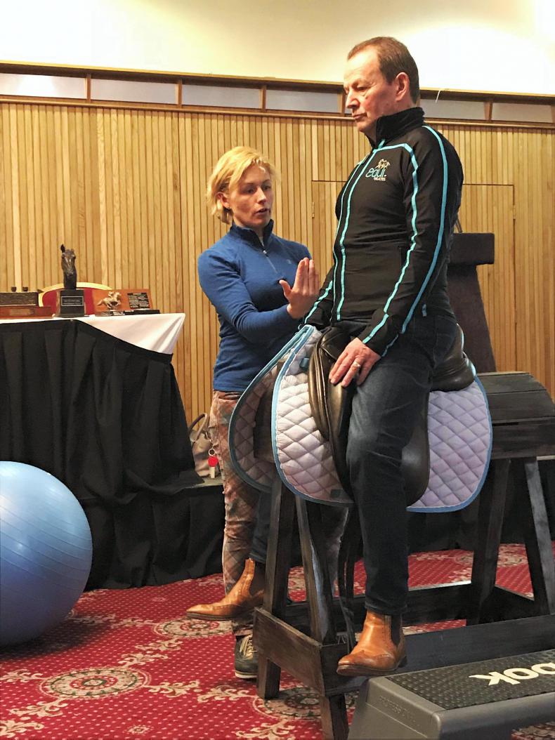 The afternoon sessions comprised of two workshops. Lisa Allen demonstrated rider biomechanics assessments supported by student, Ralph Robinson (Level 3 aquine apprentice who is currently completing his apprenticeship with five-star event rider Joseph Murphy). The sessions highlighted the importance of correct alignment and showed different methods to help create a greater awareness in the riders.