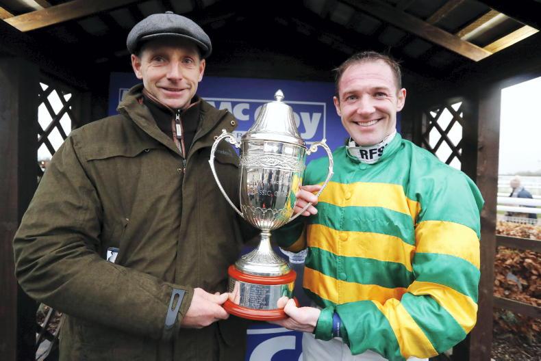 John O’Riordan speaks to conditional jockey Shane Markey following his first win in the saddle