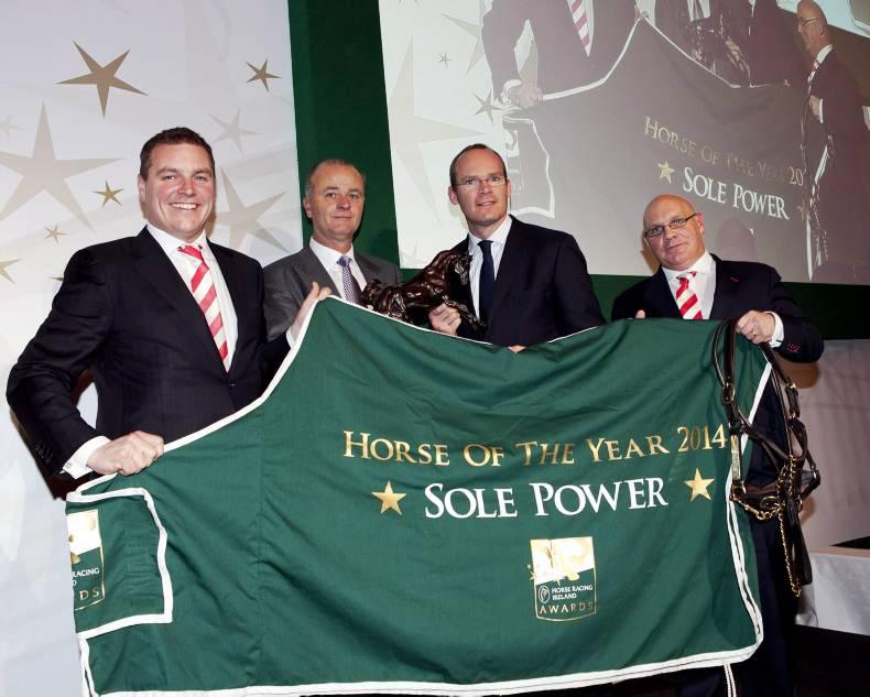 Minister Simon Coveney, Paddy and Willie Power and Eddie Lynam with Sole Power's Horse of the Year Award at the 2014 Horse Racing Ireland Awards.
