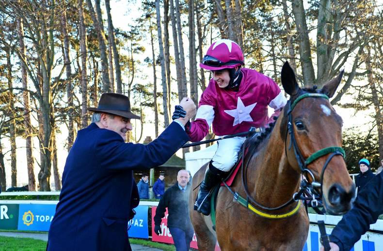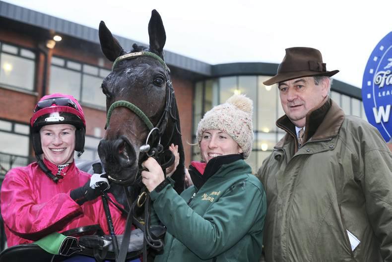 Noel Meade greeting Nina Carberry and Russian Bill after their win at Leopardstown in December. He's entered in the Albert Bartlett