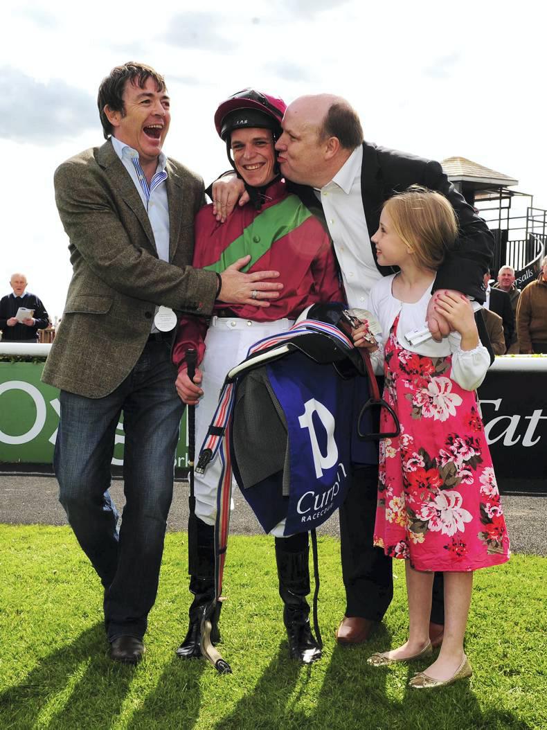 Shane Kelly gets a kiss from joint-owner Lorcan Cribben with Kieran Leavy and Gabby Cribben after Fiesolana won the Irish Stallion Farms EBF `Habitat Handicap in May 2013 (photo: Healy Racing)